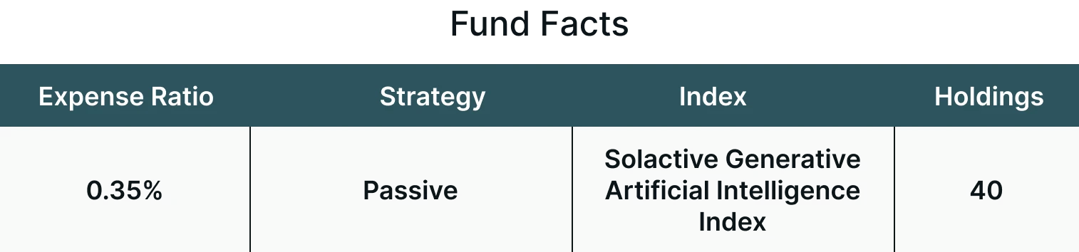 The Themes Generative Artificial Intelligence ETF (WISE) seeks to track the Solactive Generative Artificial Intelligence Index (SOLGAIN), which identifies 40 companies that derive their revenues from either: