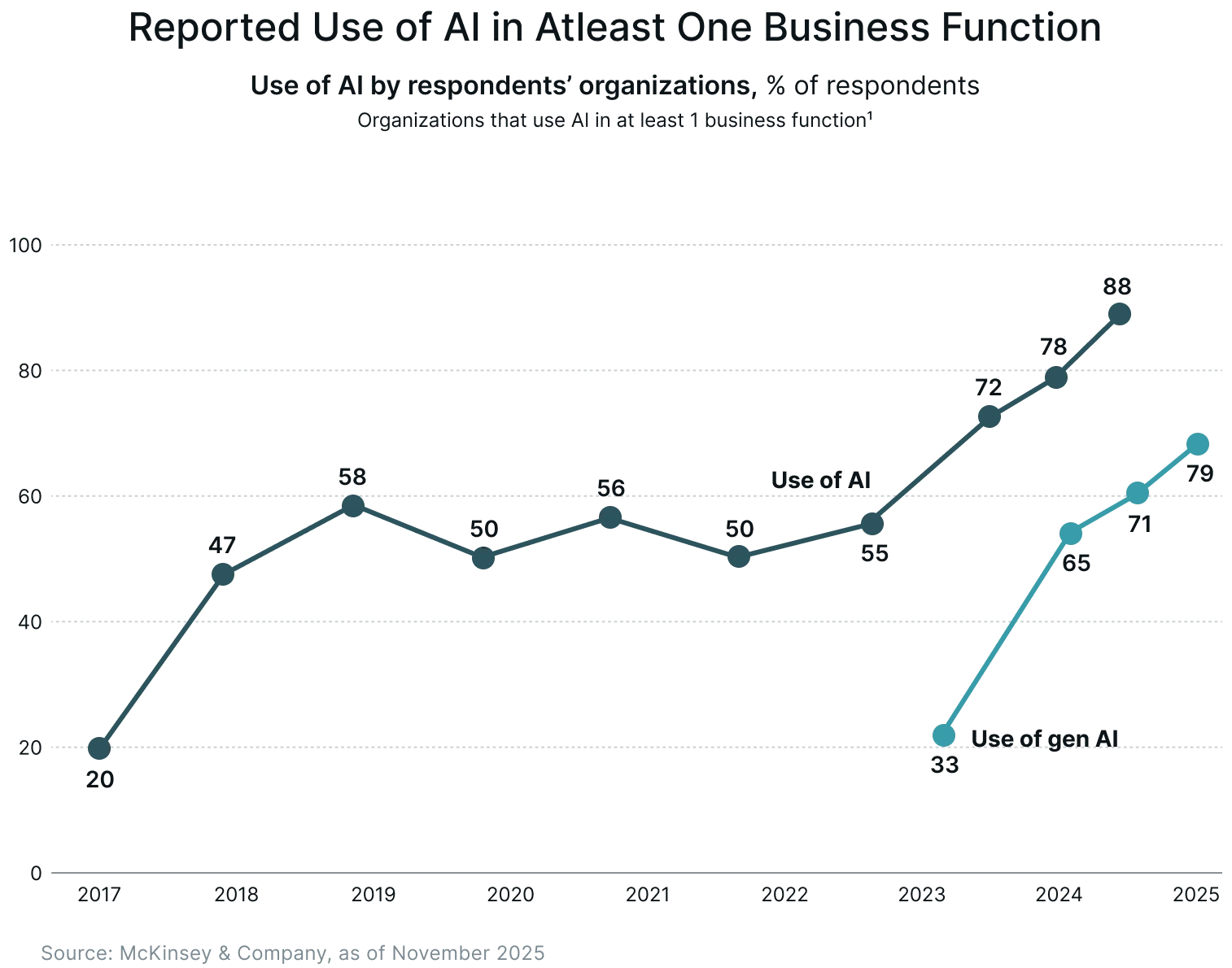 Recent global surveys show that nearly 88% organisations now use AI in at least one business function, 69% report use in two or more functions, and 50% report AI use across three or more functions, highlighting increasingly enterprise-wide integration.6