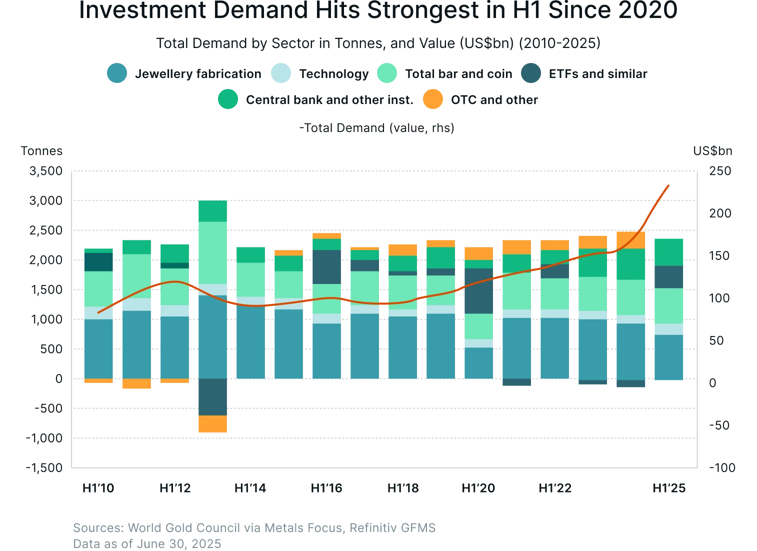 Investment demand for gold has accelerated sharply in 2025, with flows from both institutional and retail investors reaching record levels.