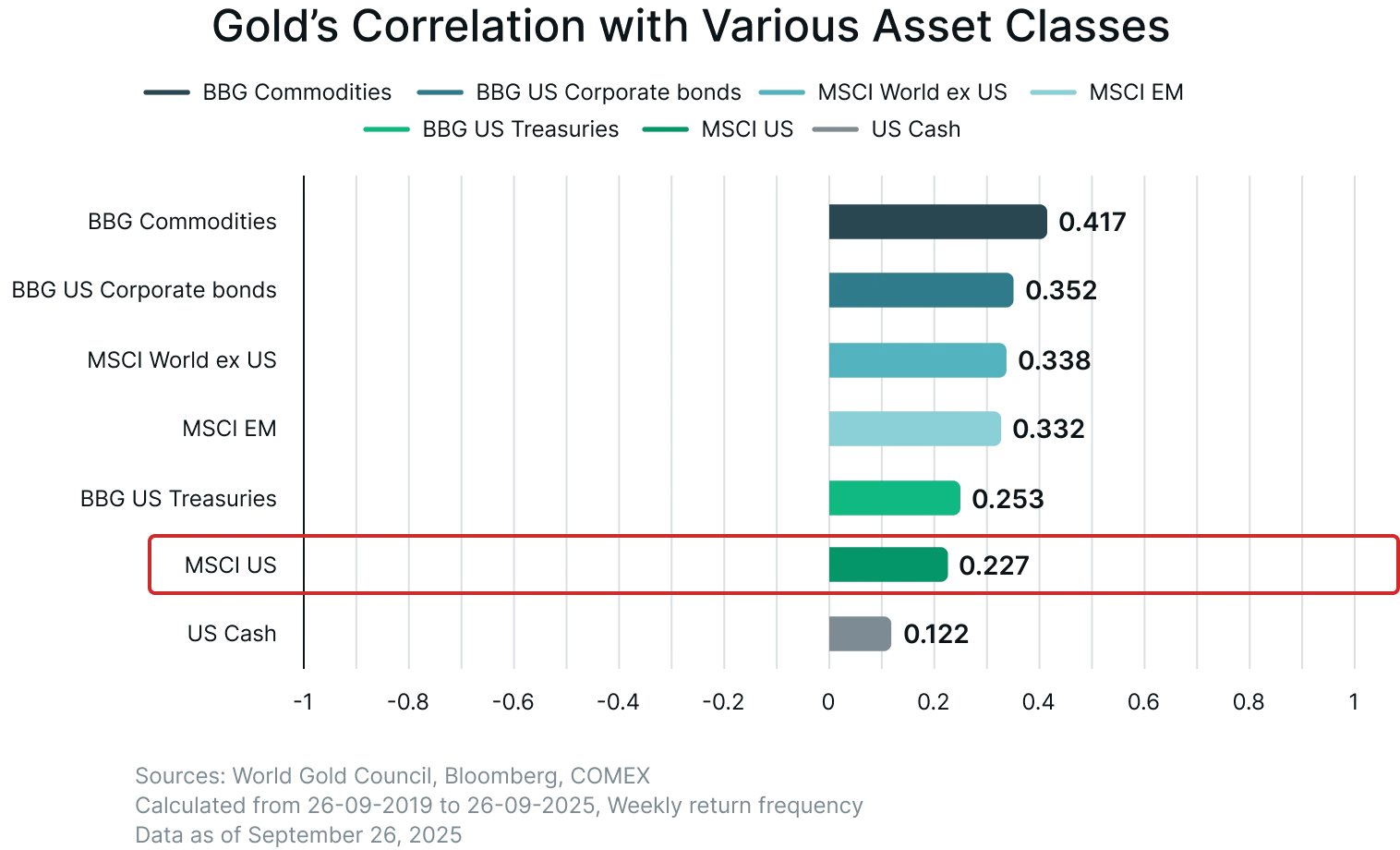 14World Gold Council, Gold Correlation to Stock, as of October 1, 2025