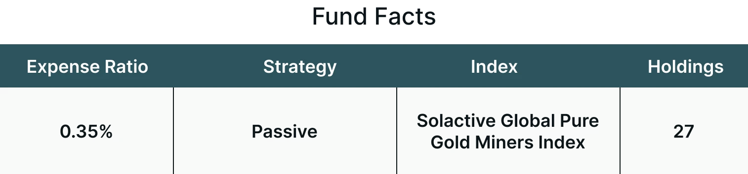 The Themes Gold Miners ETF (AUMI) seeks to track the Solactive Global Pure Gold Miners Index (SOLGLPGM), which identifies the largest 30 companies by market capitalization that derive their revenues from gold mining.