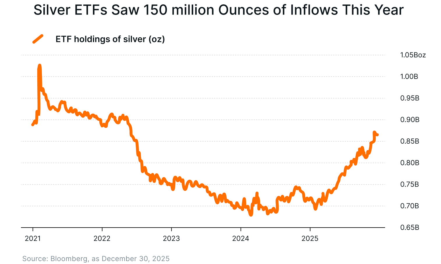 In 2025, silver ETFs recorded some of their strongest annual inflows in years, coinciding with silver prices reaching multi-year and record highs. Holdings in physical-backed silver exchange-traded funds have surged this year, rising by more than 150 million ounces.9
